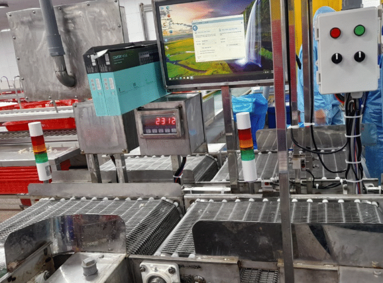 Giải pháp băng tải thủy sản thay thế con người ghi nhận các thông tin: mã công nhân, mã công đoạn, vị trí tải, thời gian hoàn thành, trọng lượng rổ hàng… được truyền đến phần mềm xử lý số liệu và kết chuyển để tính toán sản lượng công đoạn cho từng công nhân.